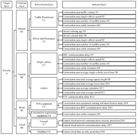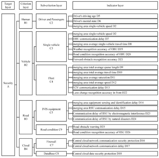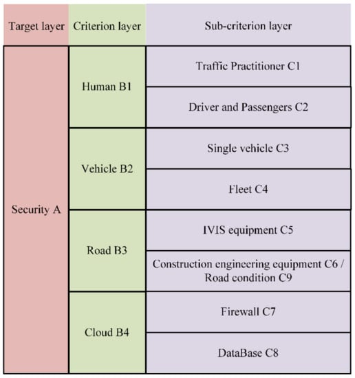The hierarchical structure of IVIS evaluation under closed conditions generally consists of four layers, which are the target layer, criterion layer, subcriterion layer, and indicator layer from top to bottom. Since [9] points out that the IVIS test conditions under closed conditions are controllable and that IVIS easily achieves optimal efficiency, we only thought over the establishment of the hierarchical structure when the objective was secure. As the network cloud has become a crucial component of the IVIS, we introduced a “cloud” based on the three scales of “human–vehicle–road”, as shown in Figure 3. In Figure 3, “A“ represents the total objective of the target layer, and Security A represents the total objective A in the hierarchical analysis is to evaluate the IVIS security; “B” represents each component in the criterion layer, which is composed of four scales of human–vehicle–road–cloud after decomposition according to the coupling characteristics of IVIS; “C” represents each component in the sub-criterion layer, which is a sub-criterion of different dimensions after further refinement on the basis of the criterion layer B, for example, to distinguish vehicle B2 by single vehicle C3 and fleet C4. Moreover, the impact of on-cloud firewalls and on-cloud databases on the central cloud in the cloud criterion was considered. From here, the upper framework was established.