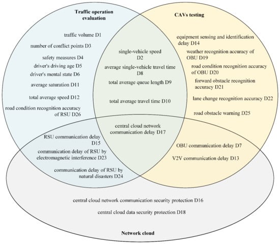 Specifically, traffic operation, travel time, congestion level, and TTC are usually used as optimization objectives in the evaluation, and those optimization objectives are generally calculated on the basis of the three major parameters of traffic (traffic volume, speed, and density)—these parameters can be transformed into each other as well, and thus the index system covers traffic volume, speed, travel time, saturation, etc. Driver behavior, vulnerability, and the uniqueness of the scenario also need to be considered, and thus the indexes also cover factors such as the driver’s mental state, construction area protection measures, number of conflict points, and extreme weather. CAV testing often is divided into functional testing of a single vehicle and cooperative testing of a cruising fleet. Since CAV technology relies on network cloud implementation, targets related to vehicle communication and network connectivity are considered in the set. In addition, the vehicle position, acceleration, and TTC are also physical quantities describing the vehicle and fleet motion state [45] and are controlled by the vehicle speed and travel time. Thus, vehicle speed and travel time are also part of the evaluation indicator set instead of position, acceleration, and TTC. Thereby, some indicators cross each other in the traffic operation evaluation and CAV testing, which are combined in the indicator set and shown only once, as shown in the overlapping part. The indicates in the overlapping part between the sets are called “common features”.
