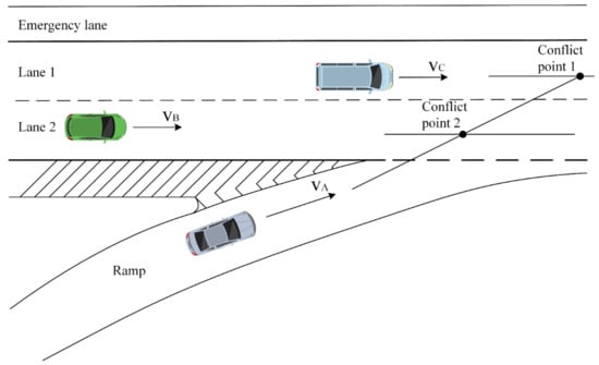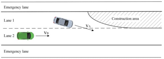 In our study, in order to exclude the influence of highly random scenario elements on the test results, a stress test was conducted under closed conditions that was based on a repeatable cut-in test on a highway scenario [17], specifically a construction area with frequent vehicle cut-ins, as well as a strength test based on on-ramp merging, which can achieve high efficiency [47]. As shown in Figure 5, the CAV on lane 1 has to cut into lane 2 because of the construction area in front. The highway construction area is a rare scenario in highways with the participation of non-drivers and traffic practitioners for operational activities, which means a certain degree of freedom for humans, and its uncertainty affects the operation of the construction area. As shown in Figure 6, when the car on the ramp is ready to enter the main road, it will intertwine with lane 1 and lane 2 on the main road to generate at least two conflict points, and the higher the traffic flow, the more conflicts there are. The on-ramp merging area is the main conflict area where traffic intertwines on the highway, and thus we used the merging zone as a scenario to construct a safety test index system under extreme conditions.