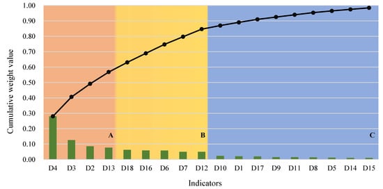 Other studies verified the usefulness of Pareto analysis (aka the activity-based classification method, abbreviated as the ABC method) in identifying the majority of critical factors that play a decisive role. For example, total quality management (TQM) is often used to analyze the crucial factors for the success of total quality management in companies [39,40,41] or to analyze the crucial factors of food safety assurance systems [42]. Therefore, the ABC method has an excellent performance in the study of key factors and is applicable to the screening of key indicators for IVIS.