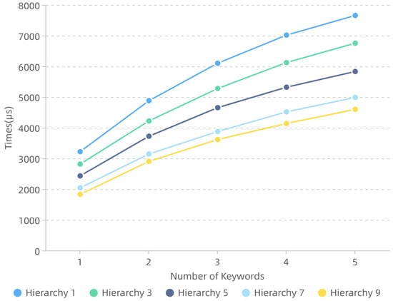 We also implement schemes [18,19] and compare their experimental results with HSE-BI. We analyzed the influence of search users’ hierarchies and the number of users on the search latency of the three schemes. We assume that the number of searched keywords in the above schemes are all set to three. Figure 5 plots the relationship between search times and hierarchies. Figure 6 plots the relationship between the number of users and the search times. It should be mentioned that we implemented multiple user searches by deploying several hosts acting as users to submit search requests to the server host simultaneously. Each user host stores one user’s private information locally and interacts with the server independently.