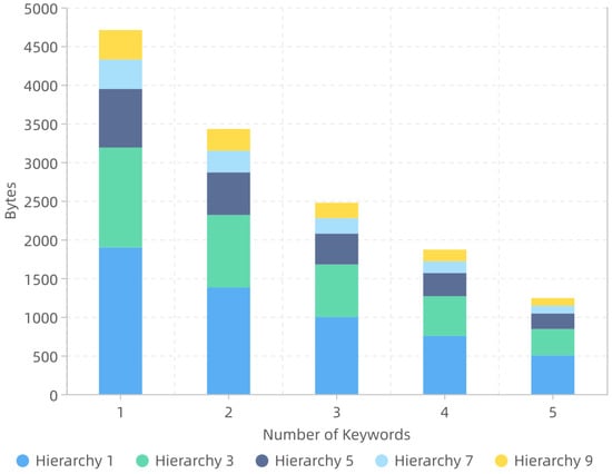We analyzed the search performance for answering requests from users of different hierarchies. The search is performed by the server, and the process includes querying and communicating with the blockchain network to obtain transaction data. The search latency and communication overhead for the different hierarchy is presented in Figure 3 and Figure 4.