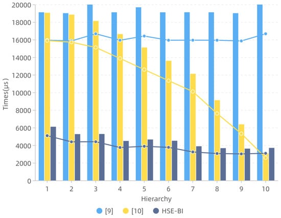 Compared with [19], the search performance of HSE-BI is less affected by hierarchy, while that in [19] has a stable, approximately linear relationship with the number of hierarchies. In detail, we observe that the HSE-BI’s search time for hierarchy 10 is 0.37 ms, which is slightly more than that in [19] (0.31 ms). Still, from hierarchy 9 to hierarchy 1, HSE-BI’s search performance is better than [19]. The increasing rate of efficiency is improved by 73% (for hierarchy 9) to 110% (for hierarchy 1), and as the hierarchy gets lower, the search latency in [19] considerably increases, more steeply than HSE-BI. One important reason is that HSE-BI supports parallel searches with a hierarchical index (especially the specific DAG-type access structure in Figure 2).