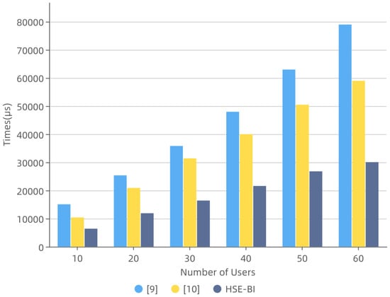 Scalability We also compared the scalability of the three schemes, which is the impact of the increasing number of users on search performance. We recorded the search times for 10, 20, 30, 40, 50 and 60 users who submitted search requests simultaneously to the server in the three schemes and plotted the relationship between the number of users and the search time, as illustrated in Figure 6. We observe that, for the same number of search users, the search performance of HSE-BI is better than others. In detail, the search time in HSE-BI is 38–49% less than [19] and 35–62% less than [18], where the curves in [18,19] are stably linear with the number of users. It is essential to notice that, in HSE-BI, the increase in search time slows down with the growing number of search users. Therefore, in the case of a large number of users, the growing number of search users has a weaker impact on the time consumption of the search protocol than [18,19]; that is, the number of users that the scheme can carry has an extensible space to meet the actual scalability requirements of hierarchical multi-user search.