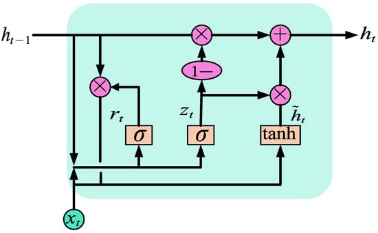 It can be seen from Figure 2 that LSTM is much more complex in network structure than RNN, and LSTM introduces cell state to memorize information. At the same time, a gating structure is introduced to maintain and control information, i.e., input gate, forgetting gate, and output gate. Although LSTM solves the problem that RNNs cannot carry out long-term memory, the network structure of LSTM is complex and the convergence speed is slow. It affects the training process and results when carrying out power load forecasting, and causes problems such as training complexity. In order to solve these problems, a variant of LSTM, gated recurrent neural network (GRU), is proposed on the basis of LSTM. It optimizes the function of LSTM and makes the network structure simple. It is a widely used neural network at present. The structure of GRU has changed from the three gates of LSTM to two gates, i.e., update gate and reset gate. The network structure is shown in Figure 3.