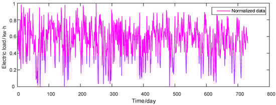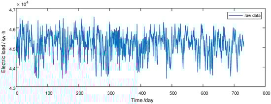In this section, the GRU model and BP model are trained and predicted, and the prediction performance is compared. The power load data used in this paper are the real power load data of an industrial user’s factory. The data set is selected from the real power load data of an industrial user in the two years from 1 January 2018 to 31 December 2020 as the training set data of the experiment. The sampling point is collected at the same time node every day, with a total of 731 sampling points. The daily power consumption load data in January 2021 are taken as the test set of the experiment, with a total of 31 data points. The environment of the electrical equipment in this factory is not affected by the external weather, and it is under constant temperature and humidity all the year round. The original power load data after missing or abnormal value processing are shown in Figure 4.