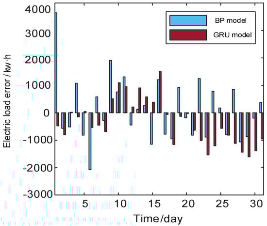 It can be seen from Figure 6 that the trend of the GRU model curve is closer to the test curve and smoother. However, the BP model curve has a relatively turbulent trend, and it is difficult to judge local fluctuations in time and respond quickly. The main reason is that the BP neural network cannot remember and save information, while GRU has the function of long-term memory, which can better remember and store previous data. In order to more intuitively compare the prediction results of the two models, Figure 7 shows the numerical value and curve comparison of the prediction error of the model.