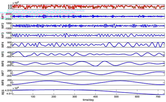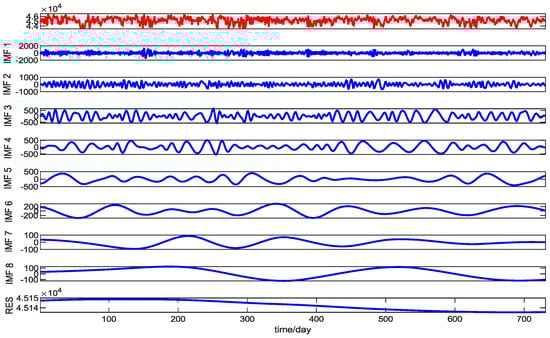 In the process of CEEMD decomposition, the signal-to-noise ratio Nstd of 0.01–0.5, the number of white noise additions NR of 50–300, and the parameter value of the maximum iteration number Maxiter of no more than 5000 are usually added to obtain a good decomposition effect. After several decomposition tests, the parameter values selected for the final decomposition in this paper are set as Nstd = 0.2, NR = 200, and Maxiter = 5000. This section selects the preprocessed training set load data in Section 2.2.2, and decomposes the training set data with CEEMD and EMD algorithms. The decomposition results are shown in Figure 11 and Figure 12.