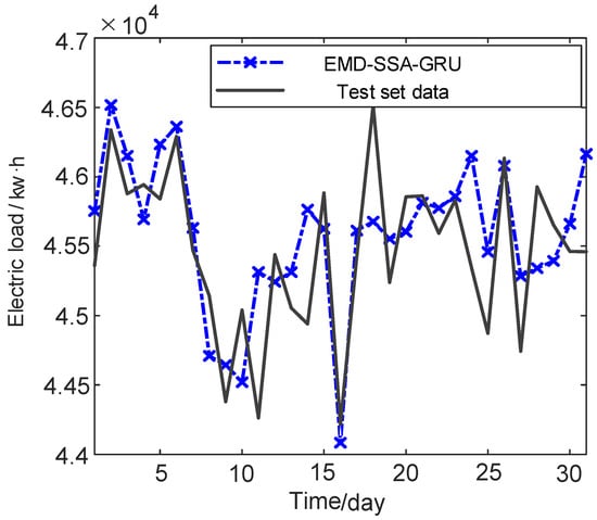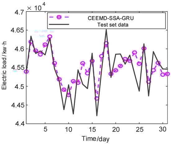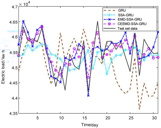 The prediction accuracy of the CEEMD–SSA–GRU model reaches 99.36%, and the prediction result of the CEEMD–SSA–GRU model is the most accurate. Its prediction accuracy is obviously better than the other three models, and the fitting degree of the curve is the closest to the real curve. Therefore, the CEEMD–SSA–GRU model has more advantages in short-term power load forecasting and can better provide reliable forecasting trends for industrial users.