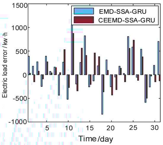 The curve fitting degree of the CEEMD–SSA–GRU model is higher than that of the EMD–SSA–GRU model, and the number of extreme points close to the real value is higher. In order to more intuitively see the prediction of the two models, the prediction errors of the two models are calculated. The comparison of the errors of the two models is shown in Figure 15.