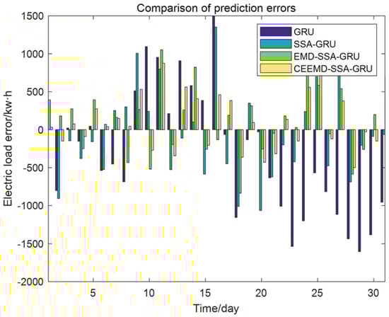 We compare the prediction effect of CEEMD–SSA–GRU model with that of single GRU model, the GRU model optimized by SSA, and the EMD–SSA–GRU model. The comparison of the prediction curves of the four models is shown in Figure 16 and the comparison of prediction errors is shown in Figure 17.
