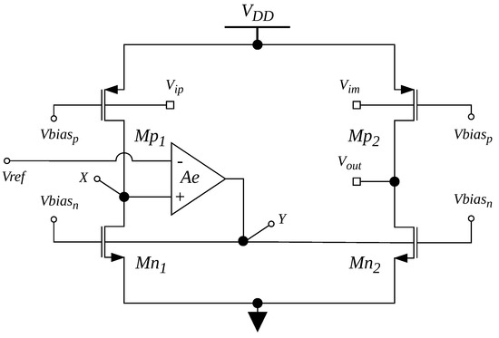 To explain the operating principle of the proposed enhanced D2S, the block scheme depicted in Figure 5 can be used. Starting from the positive input voltage V i p , the body transconductance gain of M p 1 is denoted as g m b p 1 . Then, the generated current is added with the one generated by the body transconductance gain of M n 1 and is then converted in voltage at the X node, thanks to the output conductance of M n 1 and M p 1 . Then, the generated V X voltage is compared with a reference voltage V r e f and the difference is amplified through the error amplifier whose gain is modeled as A e . Then, the generated V Y voltage is used to close the negative feedback through the body transconductance gain of M p 1 . The V Y voltage is used to sum in phase the current generated by M p 1 with the one generated by M p 2 ; the two transconductance gains (i.e., the one by V i p and the one by V i m ) are added in phase for the differential input signal and are subtracted from the common-mode input signal. Thus, the loop enhances the precision of the current mirror, defines a node voltage at the X node and also improves the CMRR of the architecture. Indeed, given the block scheme of Figure 5, the Y voltage can be expressed as: