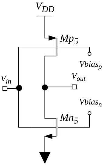 The topology of the output stage of the OTA is depicted in Figure 7. It is composed of two body-driven gate-biased transistors M p 5 M n 5 . This stage results to be very robust to the PVT and mismatch variations due to the fact that the biasing currents are accurately set through the gate terminals of both the P M O S and N M O S devices which are connected to V b i a s p and V b i a s n , respectively. Moreover, the body-driven technique allows to attain a symmetric slew rate due to the fact that the body terminals of the P M O S and N M O S devices behave in a similar way.