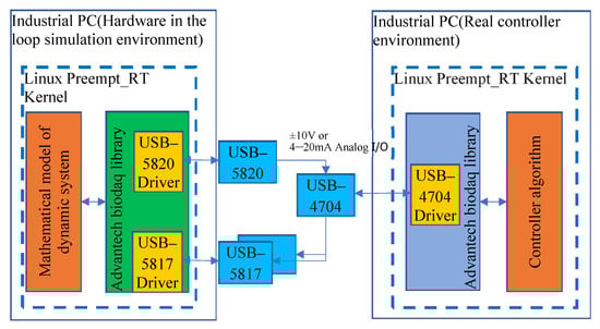 The operation principle of the HIL simulation platform is that, with the help of the open source numerical algorithm library GSL [], the system of differential equations described by the state space is numerically solved using the Runge–Kutta algorithm under the Linux+Preempt_RT real-time environment, and the results of solution operation are outputted by the USB-5820 data acquisition card for analog output (usually ±10 V or 4–20 mA signal). In this way, the physical object under control and its sensor output are simulated, providing a real-time input signal for the controller. At the same time, the HIL simulation platform, with the help of the USB-5817 analog input data acquisition card, reads the control signal of the physical controller (usually ±10 V or 4–20 mA signal) with a period of 1 ms, which is applied to the input of the state space equation, and the differential equation is solved and calculated based on the new control input to obtain the new state variable, which is then outputted with the help of USB-5820 data acquisition card. Outputting continues, so on and so forth, and the basic function of the HIL simulation platform is completed.