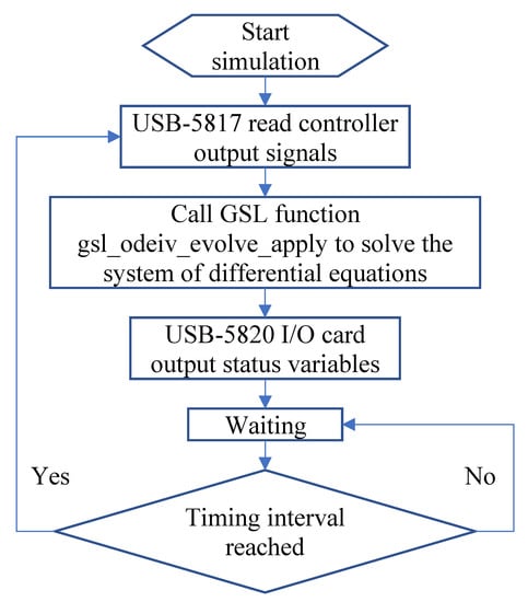 The difference from the previous section is that, instead of executing the system identification algorithm in each timing loop of the controller, the backstepping algorithm introduced in Section 3 is executed. The HIL simulation system, however, still uses 1 ms as the timing cycle to complete the fixed cycle of reading the data acquisition card signal, numerically solving the state equation of the VCSC system and outputting the solved state variables through the data acquisition card.