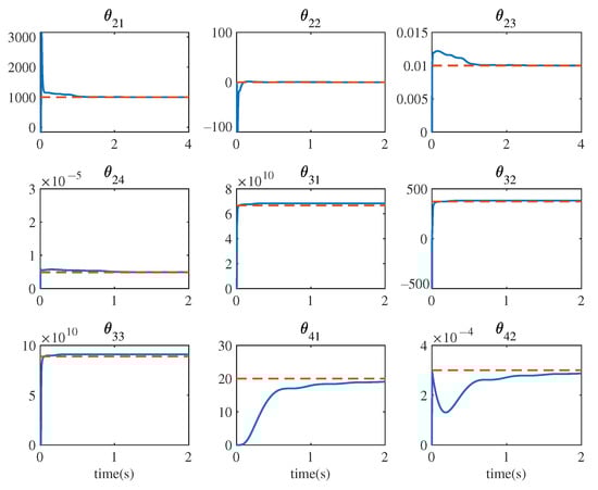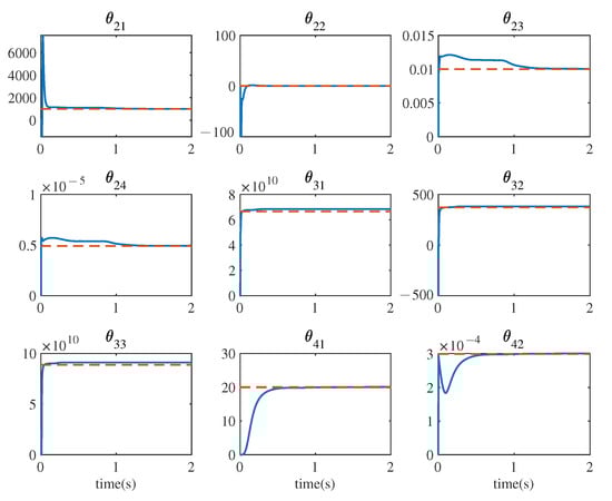 Regarding point 1, the dynamic equation of the VCSC, as shown in (7), has been described in the previous section. Using this form, the requirements of the system dynamic characteristic equations for both online identification and backstepping simulation can be satisfied. The system parameters obtained from the identification can be directly adopted by the backstepping control algorithm, which ensures the coordination of the online identification algorithm and the backstepping control algorithm. Meanwhile, the equation of (7) takes into account the load spring stiffness, the internal leakage of the hydraulic cylinder, etc., and can reproduce all the dynamic characteristics of the controlled physical entity, and this characteristic equation is accurate.
