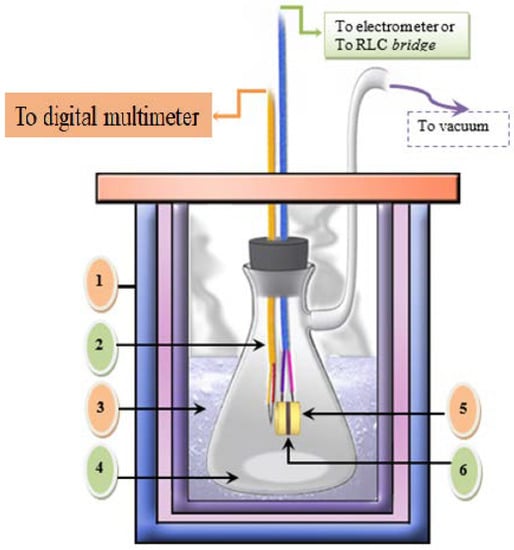 The cell used for measuring DC resistivity and dielectric measurements of the nano-composite samples. 1—insulating jacket. 2—thermocouple. 3—liquid nitrogen. 4—vacuum Büchner flask. 5—two electrodes. 6—the sample.