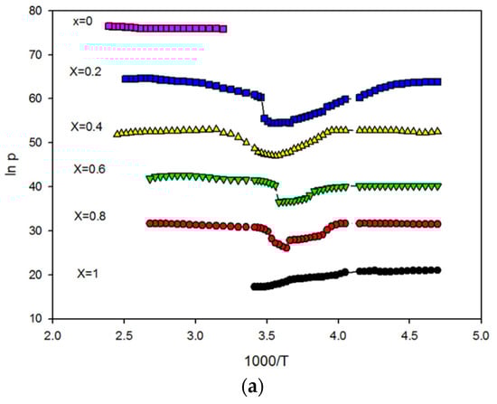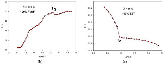 Figure 4a shows that the BZT system has a higher resistivity than the pure PVDF and (BZT-PVDF) composite. The resistivity of the composite sample decreases by increasing the PVDF content. The (ln ρ) versus (1000/T) plot shows non-linearity at high temperatures; such features are generally observed for an amorphous polymeric system such as (PVDF) as shown in Figure 4b,c.