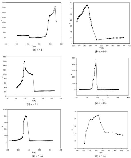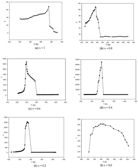 (a–f): The effect of temperature on the dielectric constant of (PVDF-BZT) and their composites at 10 kHz.