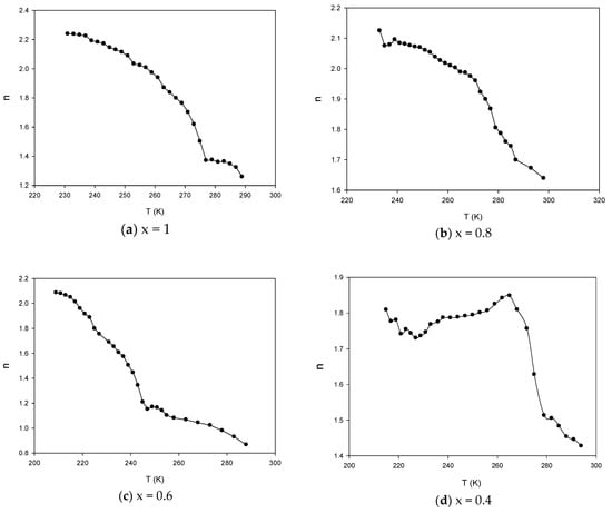 It is noticed that the variation of (n) with temperature gives information about the type of conduction mechanism. If (n) increases with temperature, the conduction obeys a small polaron tunneling mechanism. The exponent (n) is either temperature-independent or increases with temperature. On the other hand, the correlated barrier-hopping model [,] predicts that the exponent (n) decreases with temperature. The value of (n) ranged from (0.8) as a minimum value and (2.6) as the maximum value.