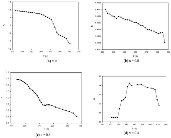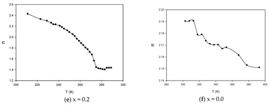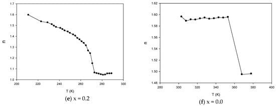(a–f): The variation of exponent (n) for the composites of (PVDF-BZT) as a function of temperature at 1 KHz.