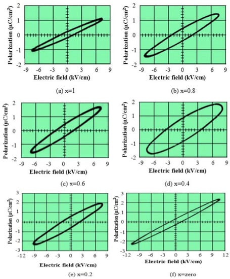 Figure 9a–f shows the ferroelectric hysteresis loop of the composite. It is noticed that the increase of BZT content raises the slope of the hysteresis loop and hence the dielectric polarization. The increase of BZT influences the shape and size of the loops as well as the numerical value of polarization. This behavior may be attributed to the dominance of smaller grain size and tetragonality.