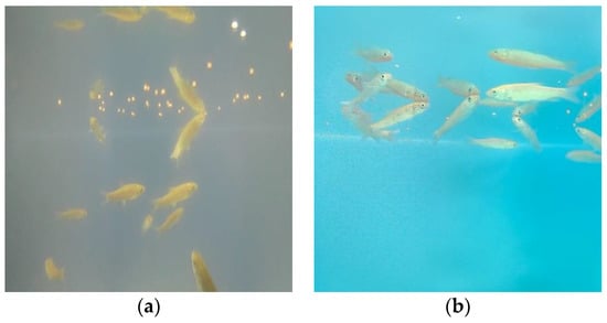 Images of fry feeding acquired in shallow underwater: (a) image acquired in sunny conditions; (b) image acquired in cloudy conditions.