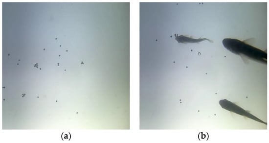 As shown in Figure 4, images of fry feeding were taken at the bottom of the pond: (a) is the image of floating uneaten pellets and (b) is the image of fry feeding behavior. In this section, the feed pellets in the images were observed and counted manually.