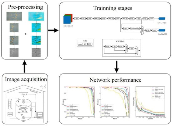 Deep learning approaches have proven to be a key technology for intelligent aquaculture systems. Existing convolutional neural networks can be divided into two categories: (1) two-stage methods and (2) one-stage methods. Although the two-stage method has higher accuracy, it is too slow due to intensive computation. The one-stage method has a simpler structure and has been proven to be applicable to the real-time identification of animal behavior [23]. At present, the most widely used one-stage network is the YOLO family network [24,25,26], which combines the RPN network with target recognition to simplify detection and improve speed; its lightweight characteristics make it possible to deploy on edge devices. Sung et al. [27] proposed an online fish detection method based on YOLO; the detection accuracy is 93%, the intersection over union (IoU) is 0.634, and the detection speed is 16.7FPS. Cai et al. [28] used a YOLOv3 network with the bottleneck of MobileNetv1 to monitor fish in a breeding farm.