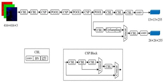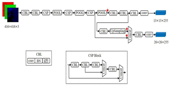In feature extraction and fusion, YOLOv4-Tiny is different from YOLOv4, which adopts spatial pyramid pooling (SPP) [33] and path aggregation network (PANet) [34] for feature extraction and fusion. The purpose of SPP is to increase the receptive field of the network, while PANet shortens the distance between features with large sizes at the bottom and features with small sizes at the top, making feature fusion more effective. The YOLOv4-Tiny algorithm uses a feature pyramid network (FPN) [35] to extract feature maps with different proportions to improve target detection speed. Meanwhile, it uses two different proportion feature maps (13 × 13 and 26 × 26) to predict detection results. The network structure of YOLOv4-Tiny is shown in Figure 8.