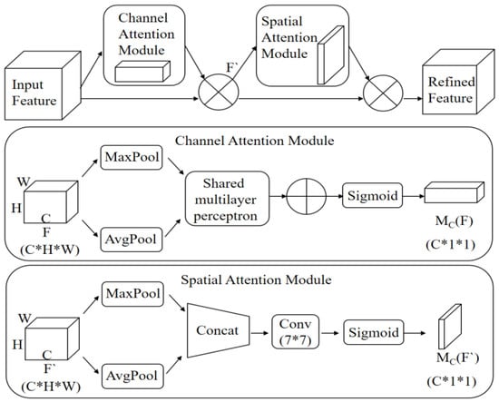 CBAM module is composed of a channel attention module and a spatial attention module in series. It calculates from the two dimensions of channel and space. Then, the attention map is multiplied by its input feature map for adaptive learning, so as to improve the accuracy of feature extraction by the model. The schematic diagram of its implementation is shown in Figure 9.
