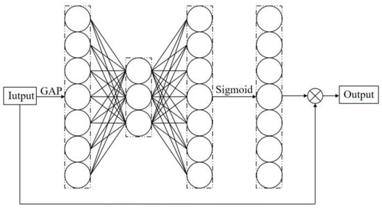 SE module is shown in Figure 10. After global average pooling (GAP) for each channel, the Sigmoid function is selected as its activation function through two nonlinear full connection layers. As can be seen from the figure, two nonlinear fully connected layers in SE module are used to capture nonlinear cross-channel interactions and reduce the complexity of the model through dimensionality reduction.