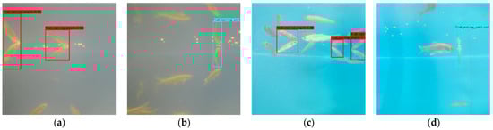 In order to verify the robustness of the YOLOv4-Tiny-ECA model, this paper tested the detection performance of the model under four different underwater shooting conditions. As shown in Figure 15, fry with angle feeding characteristics are detected in red boxes, and fry with vertical feeding characteristics are detected in blue boxes.
