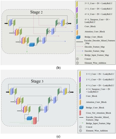 As shown in Figure 2c, the sub-network of the third stage is roughly the same as that of the second stage. Compared with the previous two-stage network, this network does not need to transmit features to the later network. In addition, the cross network attention block (CNAB) is introduced here, and the specific operation of this structure is introduced in detail later.