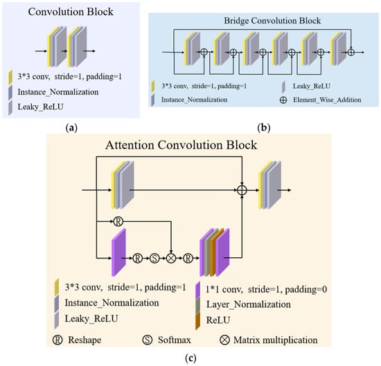 Some network modules. (a) The convolution block. (b) The bridge convolution block. (c) The attention convolution block (ACB). We applied the above processing units in the three-stage network.