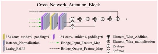 To make more effective use of the underlying feature information between networks, we designed a cross network attention block (CNAB) for the bottom bridge layer. The specific structure is shown in Figure 5, and the green lines are the input features from three sub-network bridge layers. We send these features into a set of convolution layers with shared weights and obtain three output features. Suppose the three input features are , and , respectively, and the transformation matrix of the convolution layer is . After the convolution layer, we can get three output features with the channel number of 1, and we reshape them into features with the size of (B, C, H × W). After that, through matrix multiplication, softmax, and other operations, the attention feature map is obtained. Then, the attention feature map is multiplied and added with the output feature y of the third sub-network bridge layer. We express the final output as z. The whole operation process is shown in the following formula (the reshape operation is omitted in the formula):
