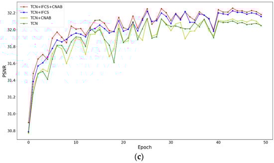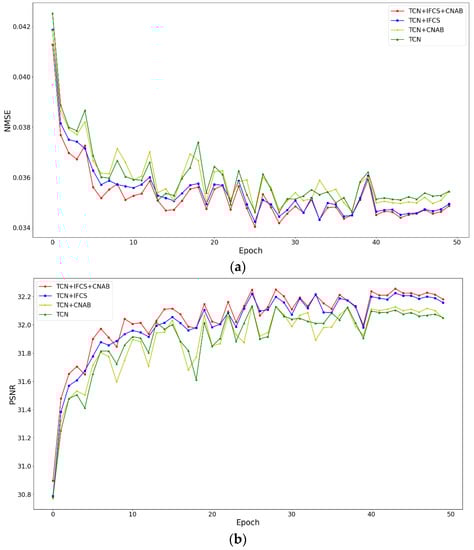 Results of ablation experiment. Used to observe the effectiveness of our proposed structure. (a) Comparison results between NMSE. (b) Comparison results between PSNR. (c) Comparison results between SSIM.