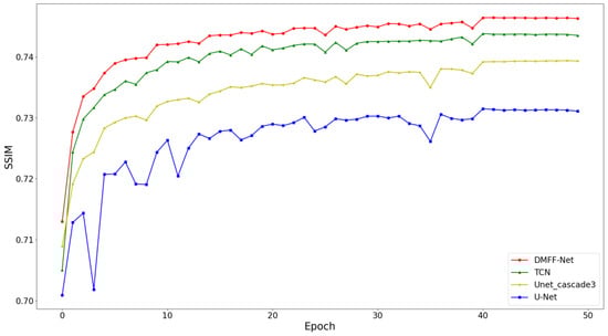 In order to see the role of each module in DMFF-Net more intuitively, we drew the experimental results of NMSE, PSNR, and SSIM respectively, as shown in Figure 6. In order to compare with the baseline network better, we also drew a comparison chart of SSIM indicators, as shown in Figure 7.
