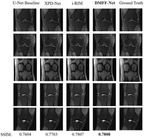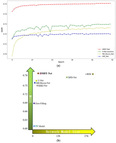 As shown in Figure 8a, the reconstruction performances of DMFF-Net, MD-Recon-Net, U-Net Baseline Model, and KIKI-Net on the validation set are shown here. It can be seen intuitively from the figure that from the first epoch to the last epoch, the SSIM of our DMFF-Net is always significantly higher than that of other methods. This result fully reflects the advantages and effectiveness of our method. Specifically, the SSIM values of DMFF-Net, MD-Recon-Net, U-Net Baseline Model, and KIKI-Net are 0.7506, 0.7262, 0.7299, and 0.7199, respectively.
