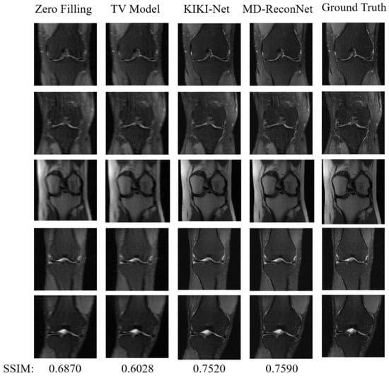 Our method is tested on the fastMRI dataset []. In the field of machine learning, large public data sets are usually used for annual competitions and benchmark tests. The research of MR image reconstruction is usually trained and verified on several small, isolated datasets. This makes it difficult to compare the performance of different methods fairly. To solve this problem, Facebook and New York University jointly produced the fastMRI dataset []. This dataset is specially used for image reconstruction of machine learning technology, including original MRI k-space data and DICOM images. k-space data includes 1594 measurement datasets obtained from a series of MRI systems and clinical patient groups’ knee joint MRI examinations, and corresponding images derived from k-space data using the reference image reconstruction algorithm [,]. The test data released by this dataset only contains incomplete k-space matrixes and undersampled images. Note that the complete original k-space matrix here is the ground truth used in our reconstruction task. The ground truth (complete k-space matrix) of the test data has not been released. We need to upload the reconstructed image correctly before we can observe the test results and the corresponding rankings in the public ranking [].