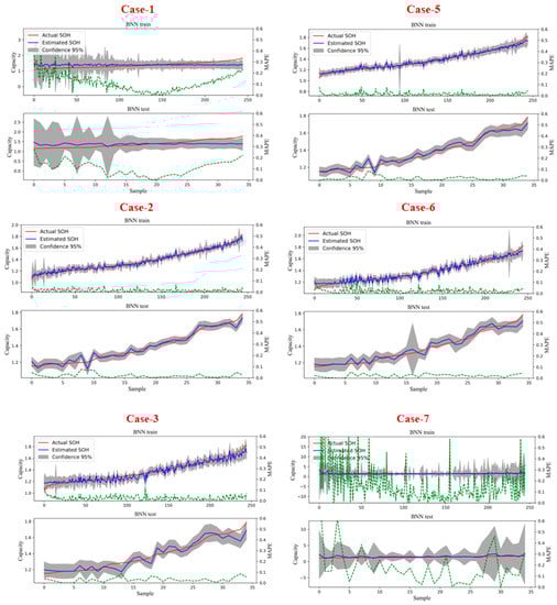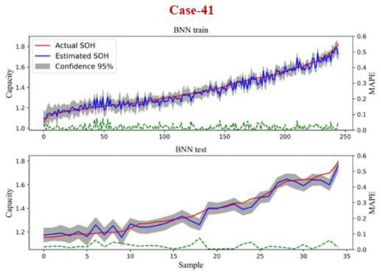 The test errors of the BNN models with different features using leave-one-out division are shown in the box line plot in Figure 22, where the RMSE is reported on the left Y-axis (red) and the MPAE on the right Y-axis (blue). The best and worst model training and test results for the three features are given in Figure 23, Figure 24 and Figure 25, respectively, with the lowest test error being on the left and the cell numbers being the cell numbers of the test set. Figure 23 and Figure 24 show the test results of the model training set with the impedance real-part and imaginary-part features based on the ARD method, respectively, and Figure 25 shows the model training and test results based on the ECM method. The training and test results based on leave-one-out method division revealed the following: