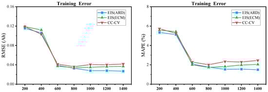 As shown in Figure 30, with specified cycle division, the three methods showed roughly uniform change patterns with the increase in the number of cycles of the training set, with 600 cycles being the inflection point at which the training and test errors were significantly reduced. Therefore, the method in this paper is expected to achieve better SOH estimation during subsequent battery operation when only the first 600 cycles of retired battery data are obtained. Regarding the training error, the ARD-based method had the highest accuracy, while the CC-CV-based method had the lowest accuracy. In terms of the test error, the ECM-based method had the best generalization performance on the test set at 600 cycles.
