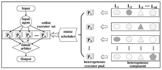 Cyberspace mimic defense (CMD) is a defense technology used against unknown attacks, proposed by Jiangxing Wu, an academic of the Chinese Academy of Engineering []. The theory of CMD introduces dynamics, heterogeneity and redundancy mechanisms into cyberspace to defend against cyberspace attacks. The basic architecture of DHR is shown in Figure 1, which primarily includes: an input agent, a heterogeneous executor pool, a heterogeneous component, a mimic scheduler, an online executor set and a mimic arbiter. Among them, the input agent is responsible for the distribution of the input data to the system. The distribution principle is duplication; that is, to replicate the input data into n copies and distribute them to n heterogeneous executors with different structures and functionally equivalents. Each executor is independent of each other and manipulates the input data in parallel. In addition, the respective results are summarized to the mimic arbiter, which is a voting module that employs a certain voting algorithm to generate voting results. The results indicate the status of every executor, whether the output data of the heterogeneous executors are consistent. In addition, the mimic arbiter feeds back the status to the scheduler. If the status shows that the behavior of some online executors is different to the others, these online executors must be replaced by offline executors from the heterogeneous executor pool. The selection of online executors to be replaced and offline executors to be online is performed by a specific scheduling algorithm, according to the current situation. In addition, the executors to be replaced should be cleaned and the recovery operations should be performed. Each executor in the heterogeneous executor pool is composed of elements that belong to different component sets. The different distribution of these elements in each executor results in a heterogeneous executor pool with different structures and functionally equivalent executors. The heterogeneity, dynamics, and redundancy of DHR provide the system with uncertainty in time and space, making it difficult for attackers to exploit the vulnerabilities of the system, which in turn gives the system endogenous defense characteristics and natural immunity.