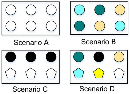 The literature [] describes heterogeneity as complexity and difference based on biodiversity and proves and deduces this definition. Intuitively, as shown in Figure 3, there are four typical scenarios for the heterogeneity of the population. Scenario A has a single type without complexity and difference, and Scenario B has many types, but the difference is small; the difference is substantial in Scenario C, but the complexity is small; Scenario D has both complexity and difference.