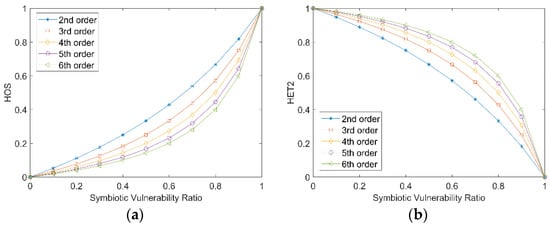 As shown in Figure 7, as the vulnerability ratio increases, the HOS gradually increases. The higher the order of symbiosis, the lower the HOS. When the vulnerability ratio is 0 and 1, HOS is 0 and 1, respectively. Moreover, as shown in Figure 7, as the vulnerability ratio increases, HET2 gradually decreases. The higher the symbiosis order, the larger HET2. When the vulnerability ratio is 0 and 1, HET2 are 1 and 0, respectively. The simulation results show that if the SDN control executor has more symbiotic vulnerabilities, higher HOS and larger HET2 can be achieved. The above simulation results also conform to common sense.
