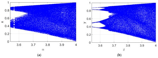 In Figure 1, the bifurcation diagram of the 2DSCLM is shown. For this purpose, the values of and parameters were increased by a step of with , , and . Then, the produced x and y sequences were displayed for 5000 iterations. The results in Figure 1 illustrate that x and y sequences are characterized by bifurcations . These results indicated that the 2DSCLM exhibits chaotic behavior.