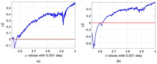 Figure 2 shows the LE values of x and y sequences produced via the 2DSCLM. From this figure, we can see that the values of LE became positive for , indicating chaos in 2DSCLM sequences. In other words, the 2DSCLM model strongly depends on its control parameters and initial conditions. This property is fundamental for any chaotic system.