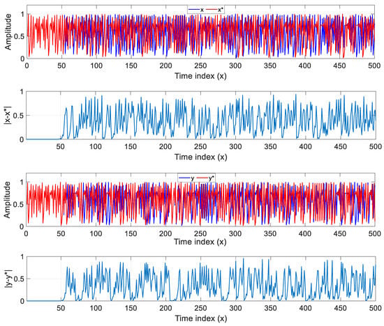 To further validate the chaotic behavior of the 2DSCLM, x and y sequences were computed for specified control parameters and initial values. Then, we slightly modified only one parameter by , and then x* and y* sequences were computed using (9). Finally, the original sequences (x and y) with (x* and y*) were generated using the varied parameter, and the difference in absolute value between these sequences are displayed in Figure 3, which shows 500 iterations of x and y sequences obtained using the parameters as well as x* and y* sequences obtained when varying the parameter by . The results displayed in this figure clearly indicate the high sensitivity of the 2DSCLM to a slight variation of its control parameters, which confirms the chaotic character of the proposed system. It can also be noticed that the first 50 iterations of the original (x and y) and modified sequences (y and y*) are identical. Therefore, this shortcoming of the 2DSCLM should be considered when integrating the proposed chaotic map into information security systems.