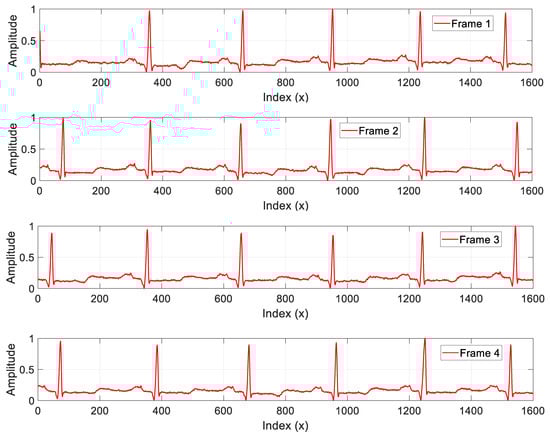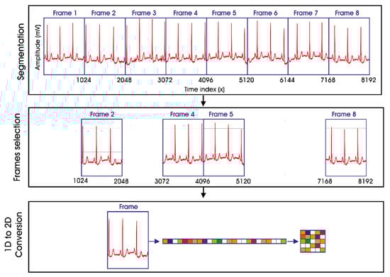 In this phase, the original signal is partitioned into equal-sized frames, as shown in Figure 5, and then four frames with different indices are arbitrarily selected. The objective of selecting four frames was to improve the security level of our scheme. Indeed, if one frame is attacked by a cutting (cropping) attack, we can use the remaining frames to validate the copyright of the protected bio-signal. Then, a 1D to 2D conversion of each frame is performed. This conversion is useful to ensure fast feature vector extraction from each frame []. In this step, the indices of the selected frames are saved in the indices vector noted (Ind).