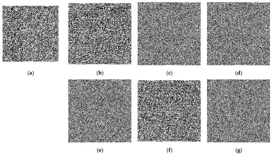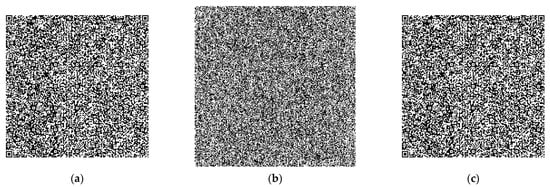 It can be seen from Figure 8b that the encrypted QR code completely masks the visual information of the original QR code (Figure 7a). As a result, no information can be retrieved from the encrypted QR code using a QR code scanner. We can also observe that the QR code image (Figure 7c) is correctly retrieved in the decryption phase using correct security keys. This finding shows good security provided by our scheme. To further support this finding, we slightly modified one of the KEY parameters in the decryption phase, and then we display in Figure 8 the decrypted QR code when using the wrong security key. The results presented in this figure confirm the strong sensitivity of our scheme to its security KEY parameters because the QR code is unrecovered when using a wrong security key, even if one security parameter is changed by a very slight variation ().